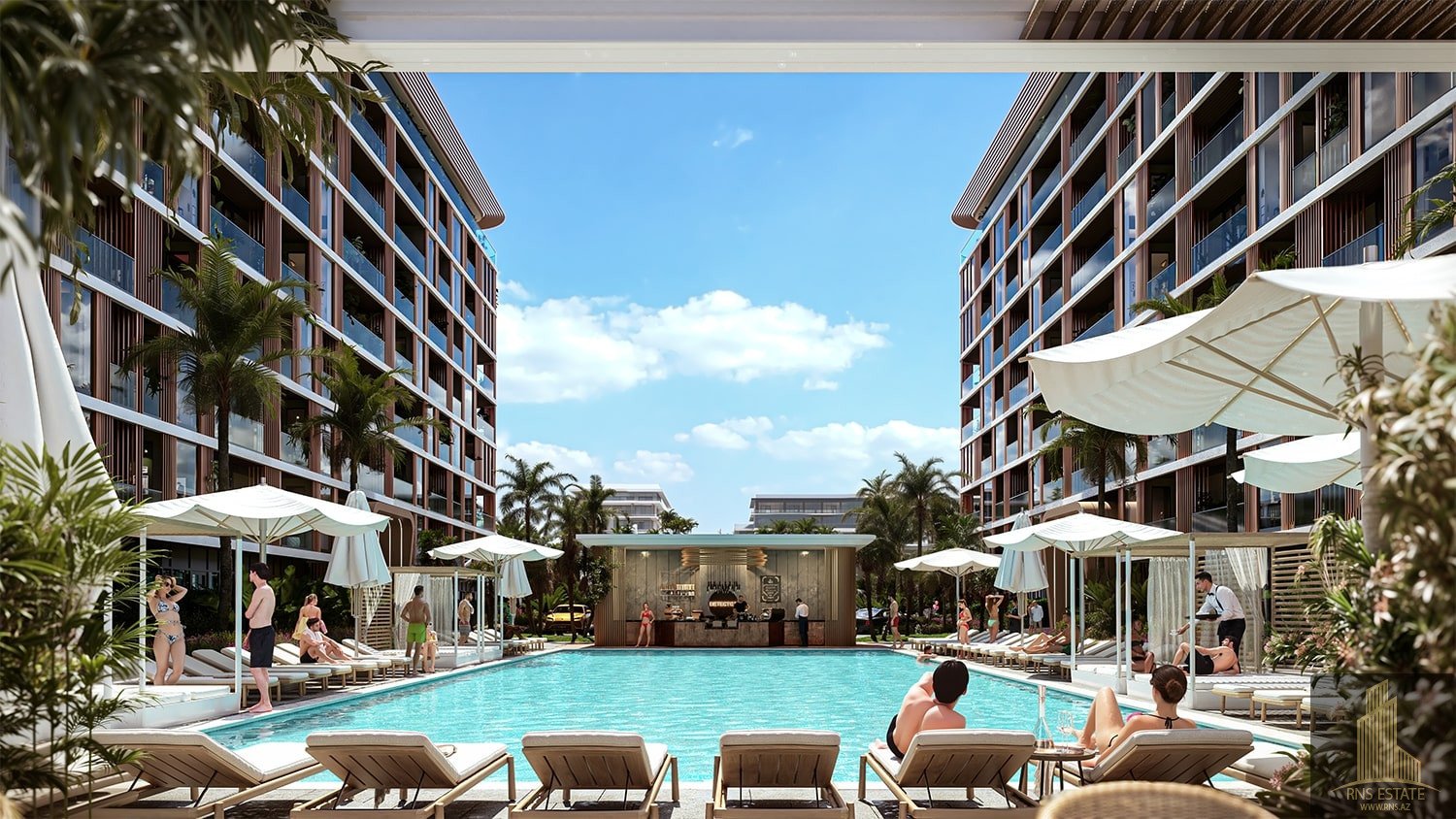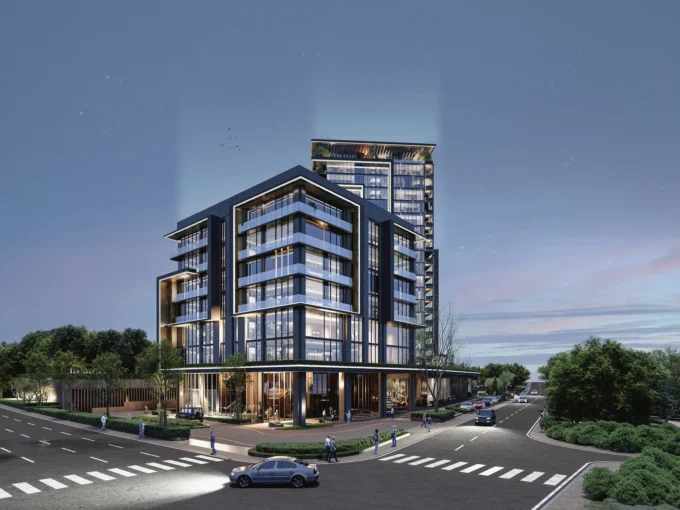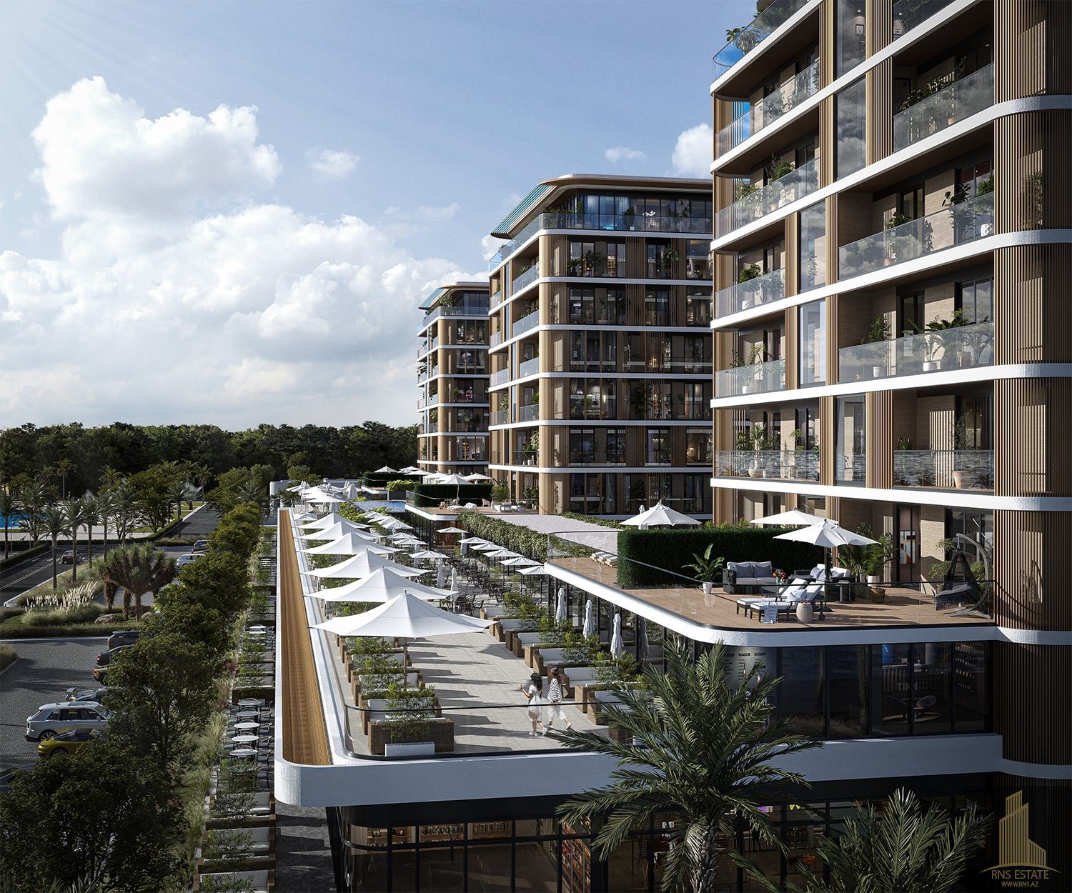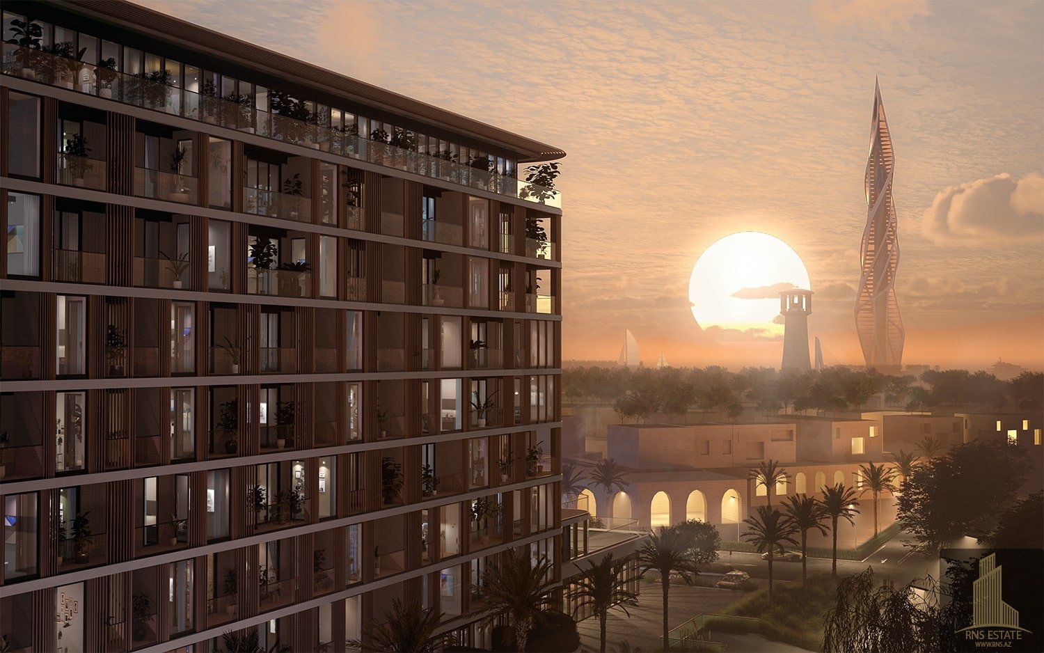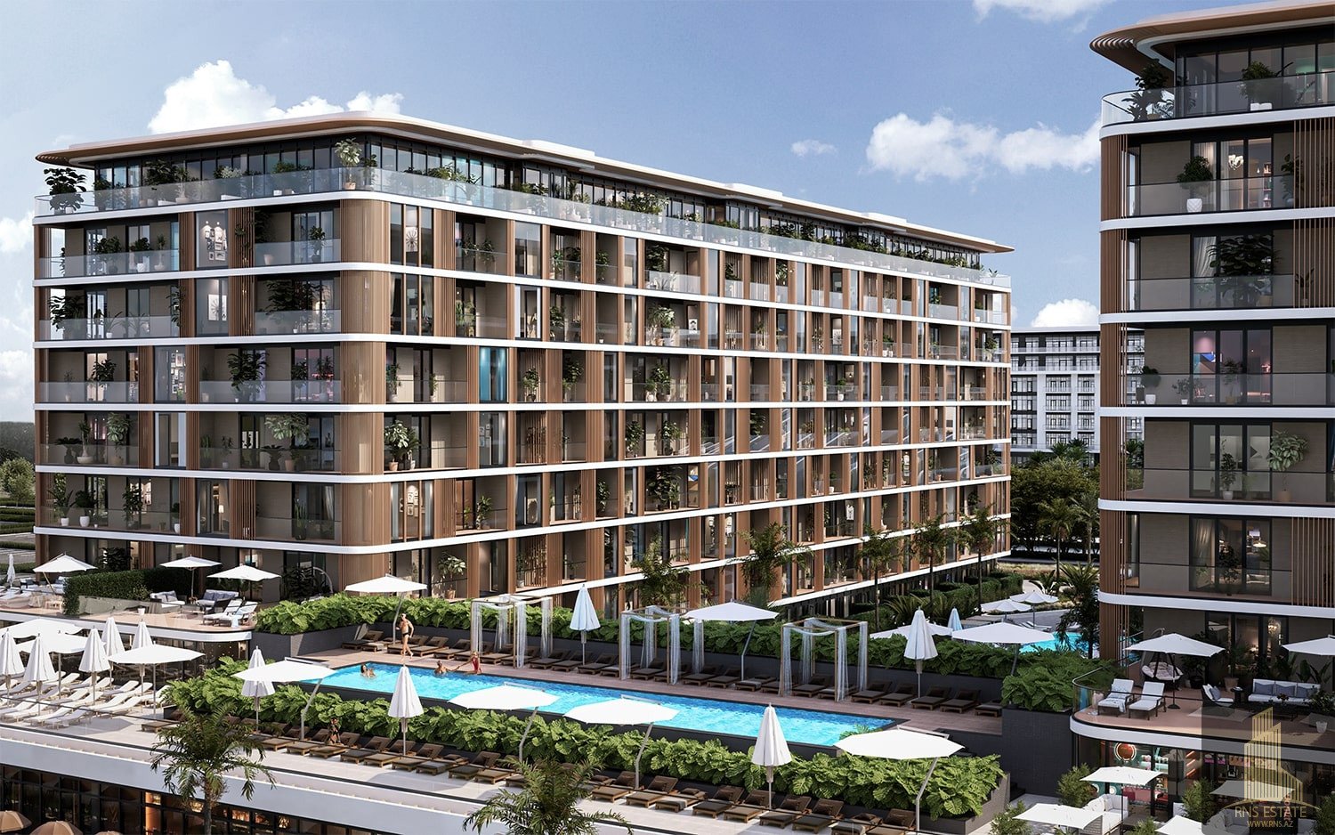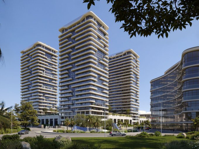 The complex offers a comprehensive infrastructure for its residents, featuring a large swimming pool, diverse cafes, and restaurants. From the windows of the apartments, residents can enjoy breathtaking views of the sea and the innovative cityscape of the future.
